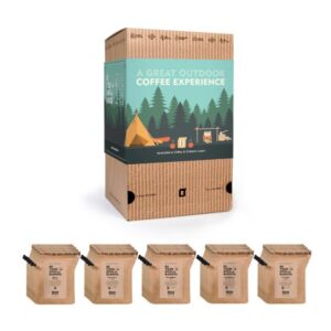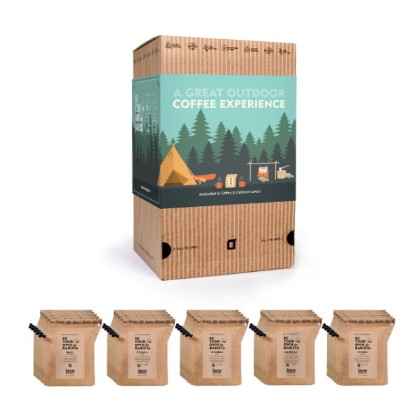 25 stk. Outdoor gaveæske indeholder 25 Coffeebrewers med specialkaffe fra 5 forskellige kaffeplantager: 5x Colombia, 5x Brazil, 5x Guatemala, 5x Honduras, 5x Ethiopia
